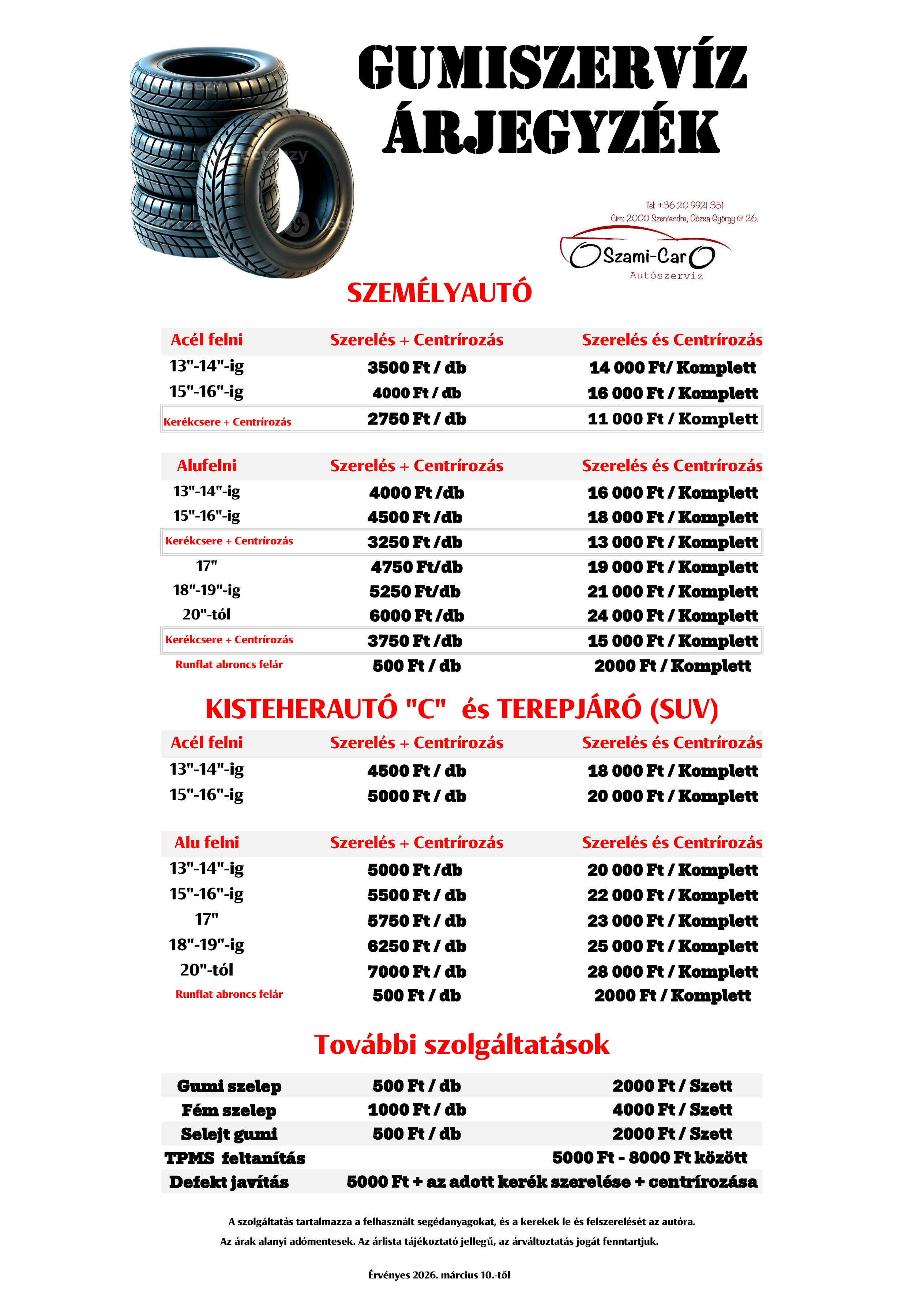 Örömmel tájékoztatjuk ügyfeleinket, hogy szervizünk szolgáltatása gumiszereléssel és kerékkiegyensúlyozással bővült. Így mostantól az autójavítás és karbantartás mellett a gumiabroncsok szerelését, kerékcserét és centrírozást is egy helyen, gyorsan és szakszerűen végezzük.